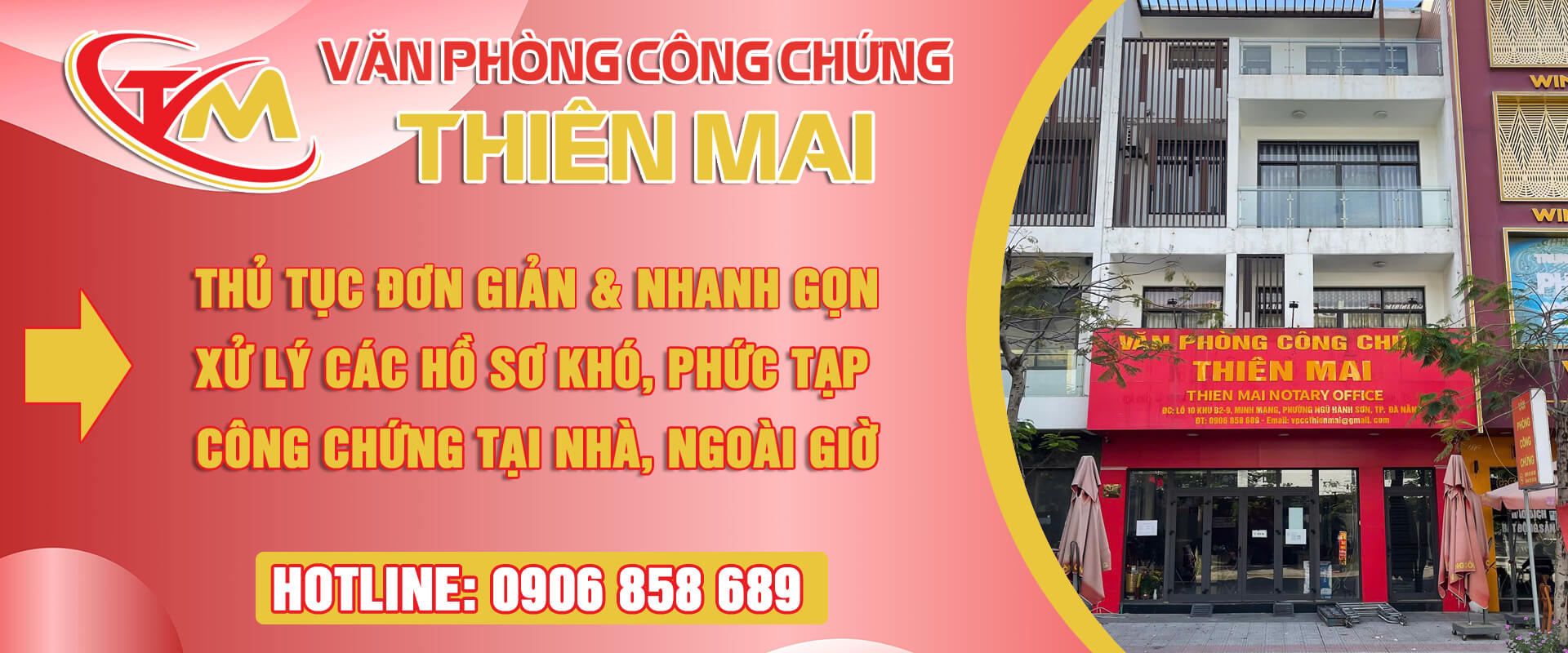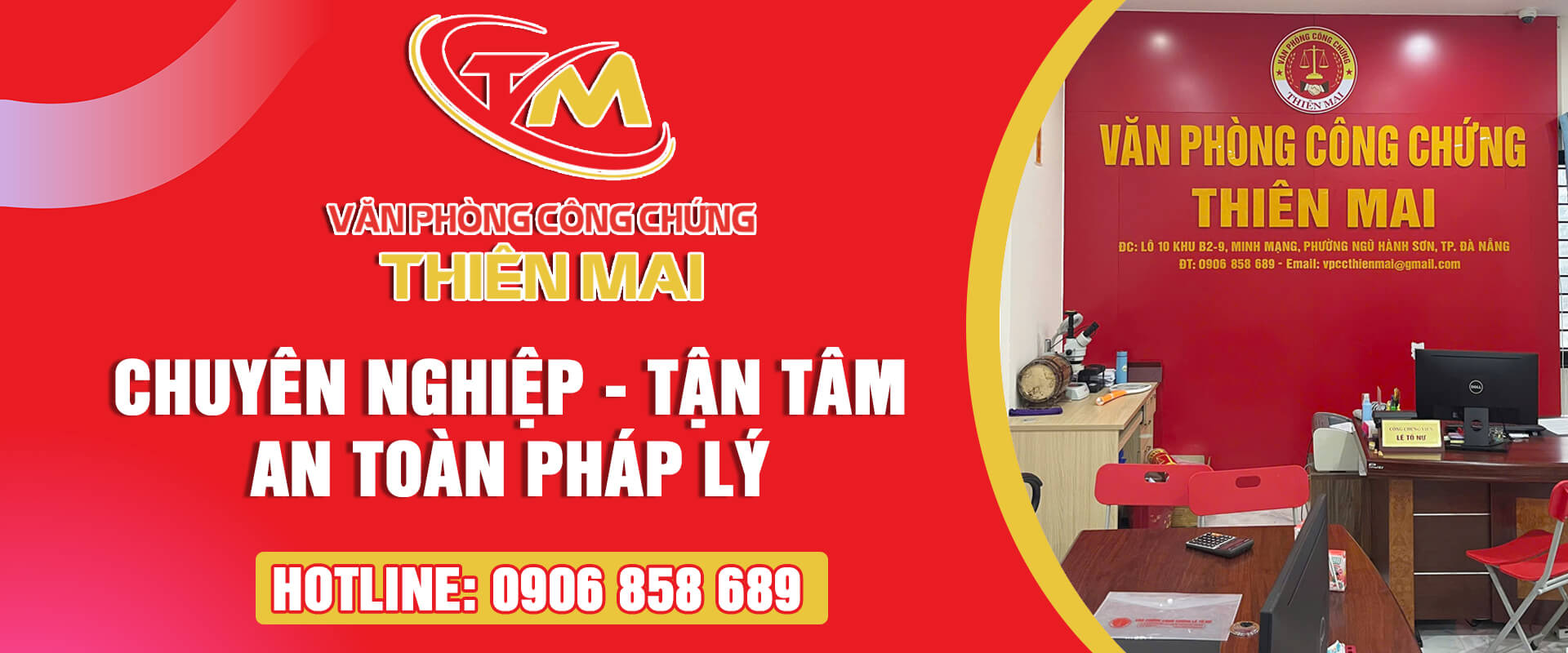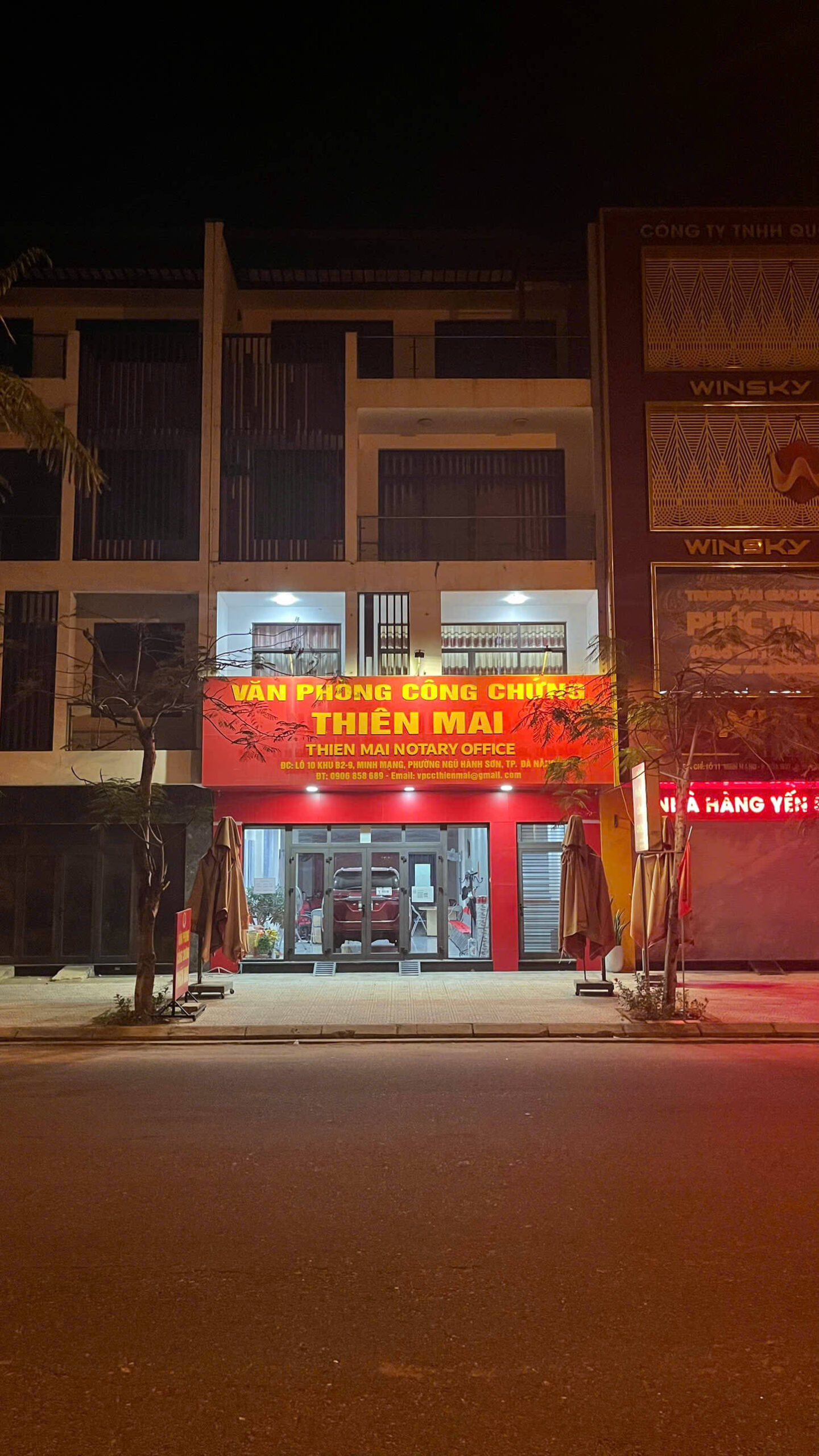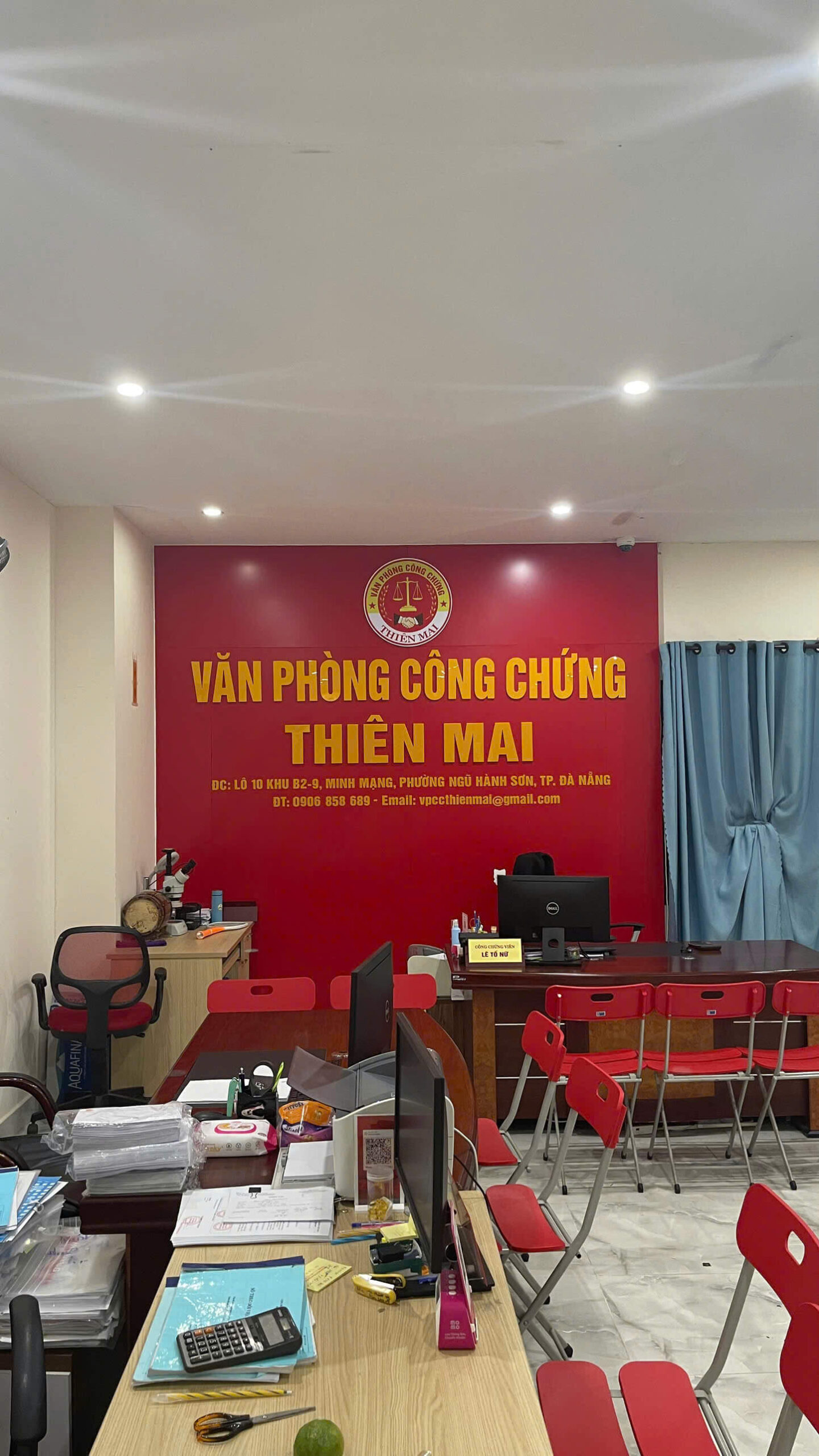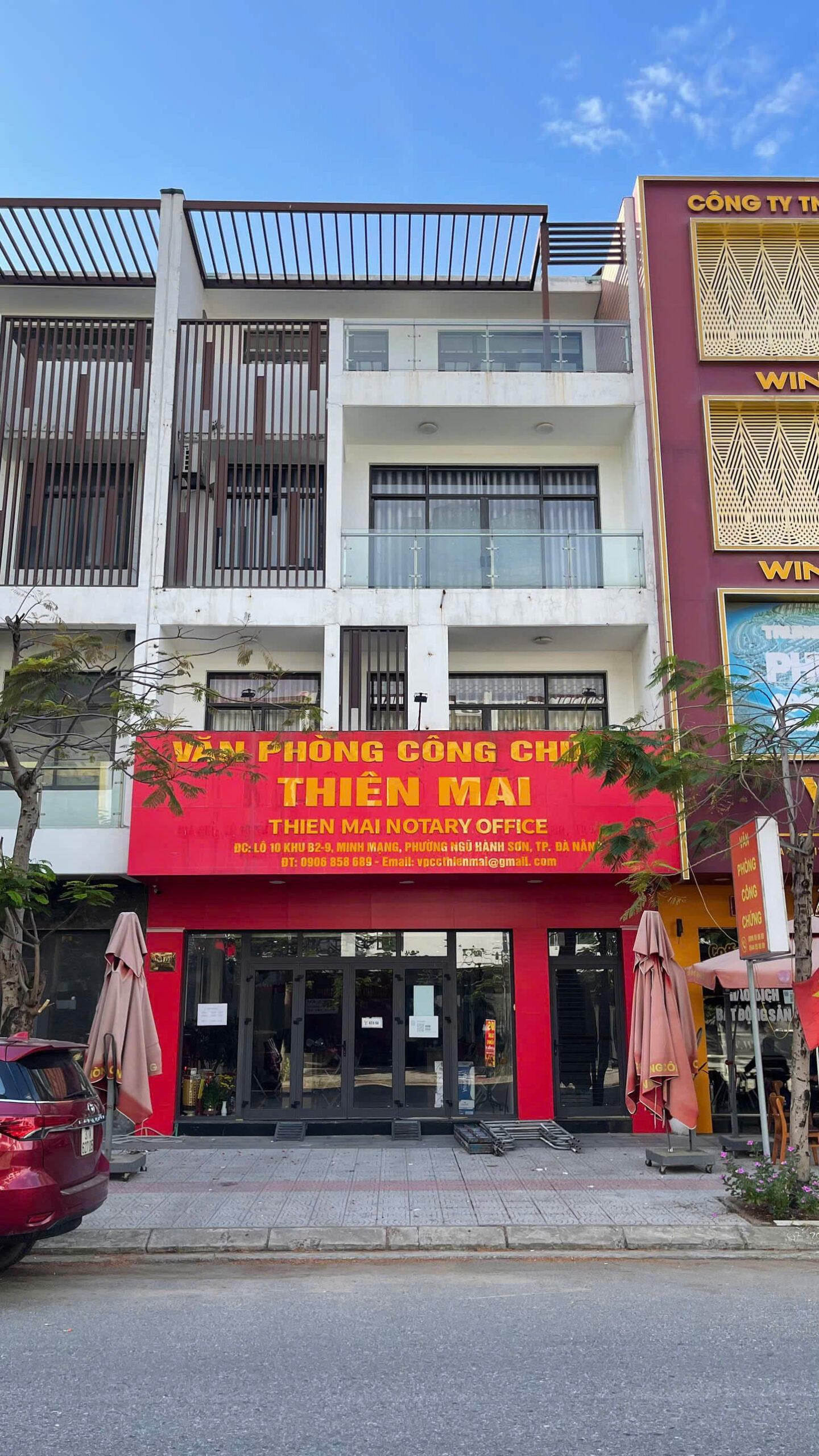 Văn phòng Công chứng Thiên Mai tọa lạc tại 337 Minh Mạng, P. Ngũ Hành Sơn, TP. Đà Nẵng, là một trong những địa chỉ uy tín, chuyên nghiệp trong lĩnh vực công chứng – chứng thực, phục vụ nhanh chóng và chính xác cho cá nhân, tổ chức.